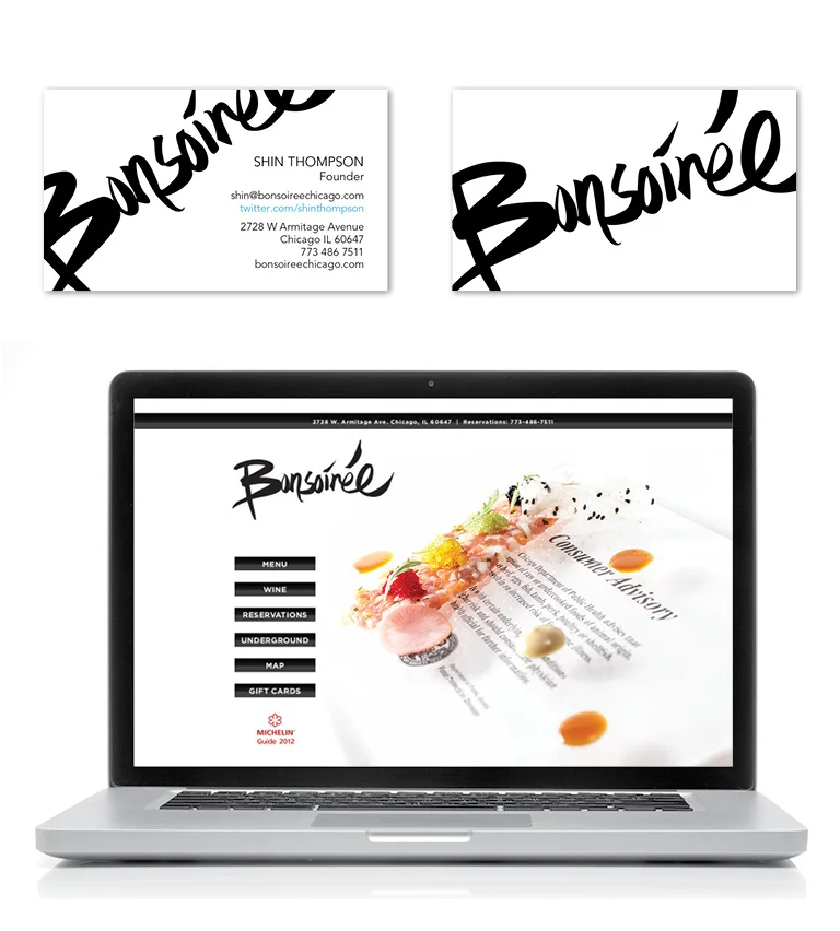 Business cards and website for former Michelin star rated Bonsoirée restaurant in Chicago.